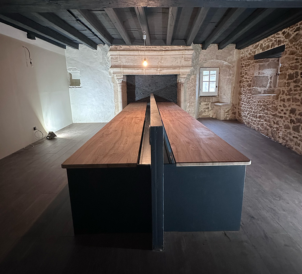 Le sol posé, on entrait enfin dans la phase gratifiante. On a attaqué la peinture des murs et de la cloison centrale pour donner son identité au lieu. C’est à ce moment-là que la pièce maîtresse est arrivée : le bureau. Pas un meuble standard, mais une création sur mesure, dessinée par Clément et fabriquée par Côme, notre menuisier. Une fois installé, il épousait parfaitement l’espace. Plus beau encore qu’en 3D.